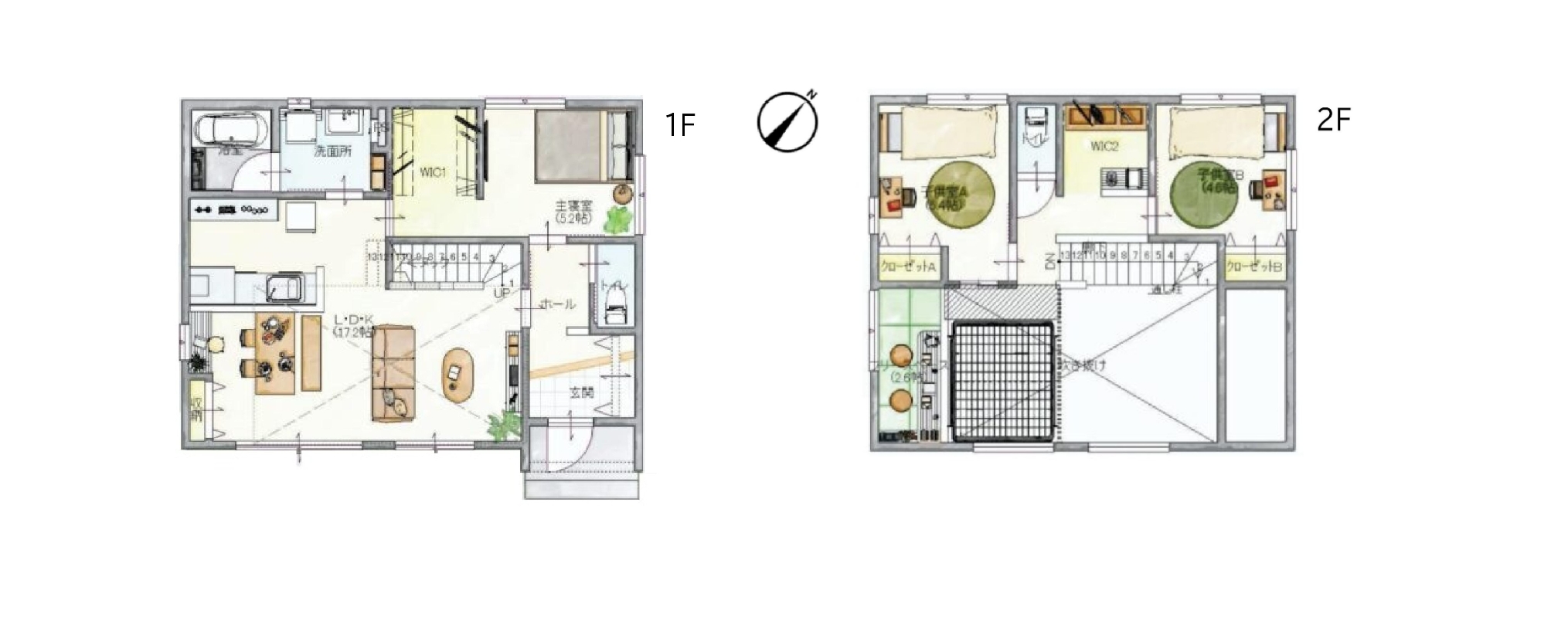吹抜けにアスレチックネットを設けた空中スペースや、多目的に使える2階畳スペース。