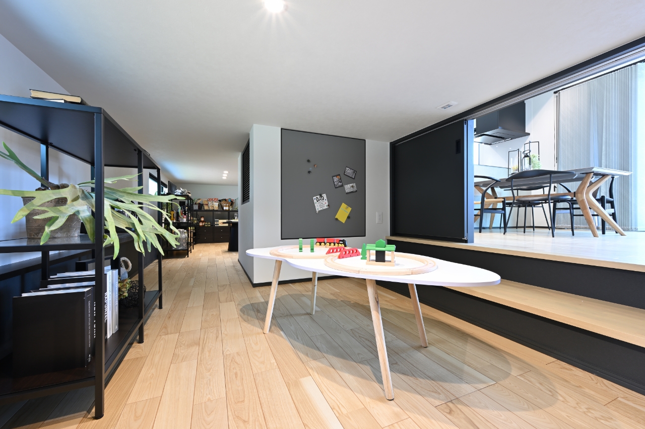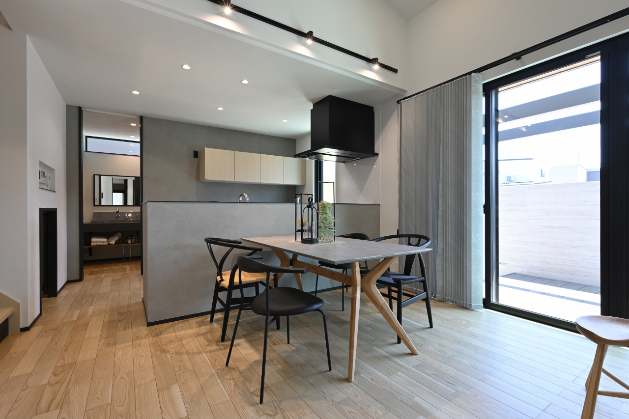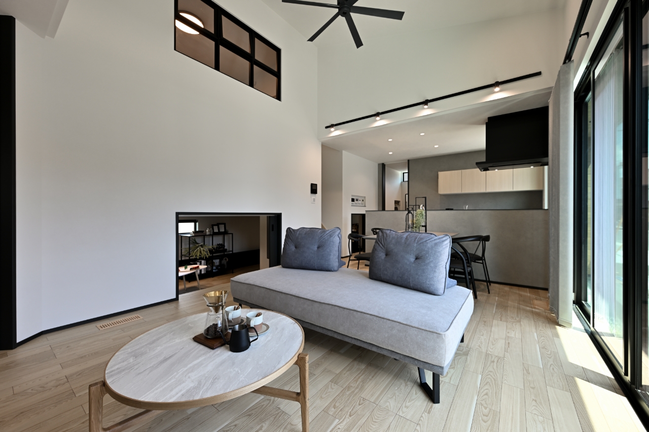 ブラックのシーリングファンやブラック格子のデザイン窓が空間にアクセントを加えます。
